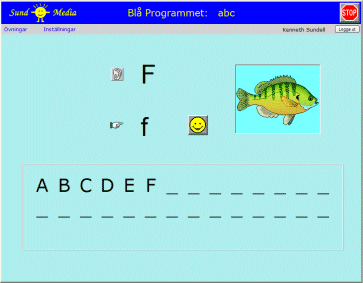 A -> a (stor bokstav först). Bokstaven presenteras som en versal på skärmen. Barnet ska då hitta motsvarande bokstav på tangentbordet och trycka på denna. På skärmen visas svaret som en gemen.