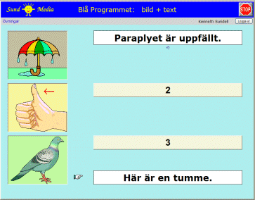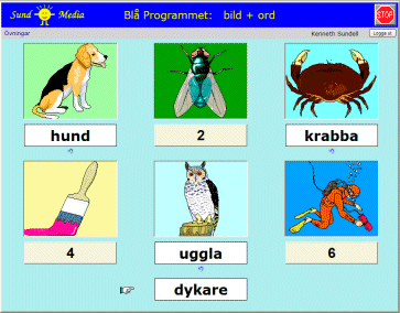 - Barnet ska nu välja rätt kort som hör samman med bilden. Detta kan göras på två sätt. Antingen genom att med musen placera markören på valt textkort och trycka ner vänster musknapp eller genom att på tangentbordet trycka på den siffra som står under textkortet.