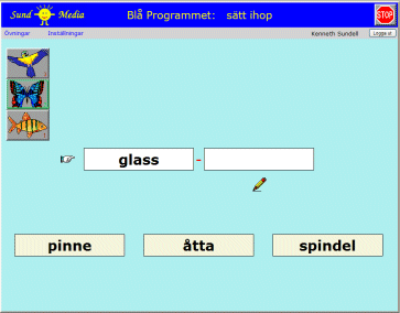 - Om barnet har valt rätt kort visas en glad gubbe och orden sätts samman till ett nytt ord. I annat fall visas en sur gubbe och barnet får möjlighet att göra ett nytt försök eftersom textkortet åker ner till sin startposition igen.