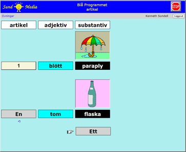 Övningen går till så att man först ska placera ut substantiven och adjektiven (enligt steg 1 - 5 nedan) och sist artikeln på samma sätt.