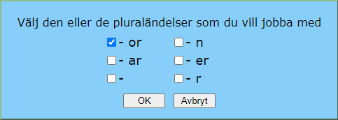 Innifrån övningen kan man genom att trycka på knappen Val... eller från menyn Inställningar välja Val av pluraländelse... få upp en dialogruta där man markerar en eller flera av de pluraländelse som man vill jobba med.